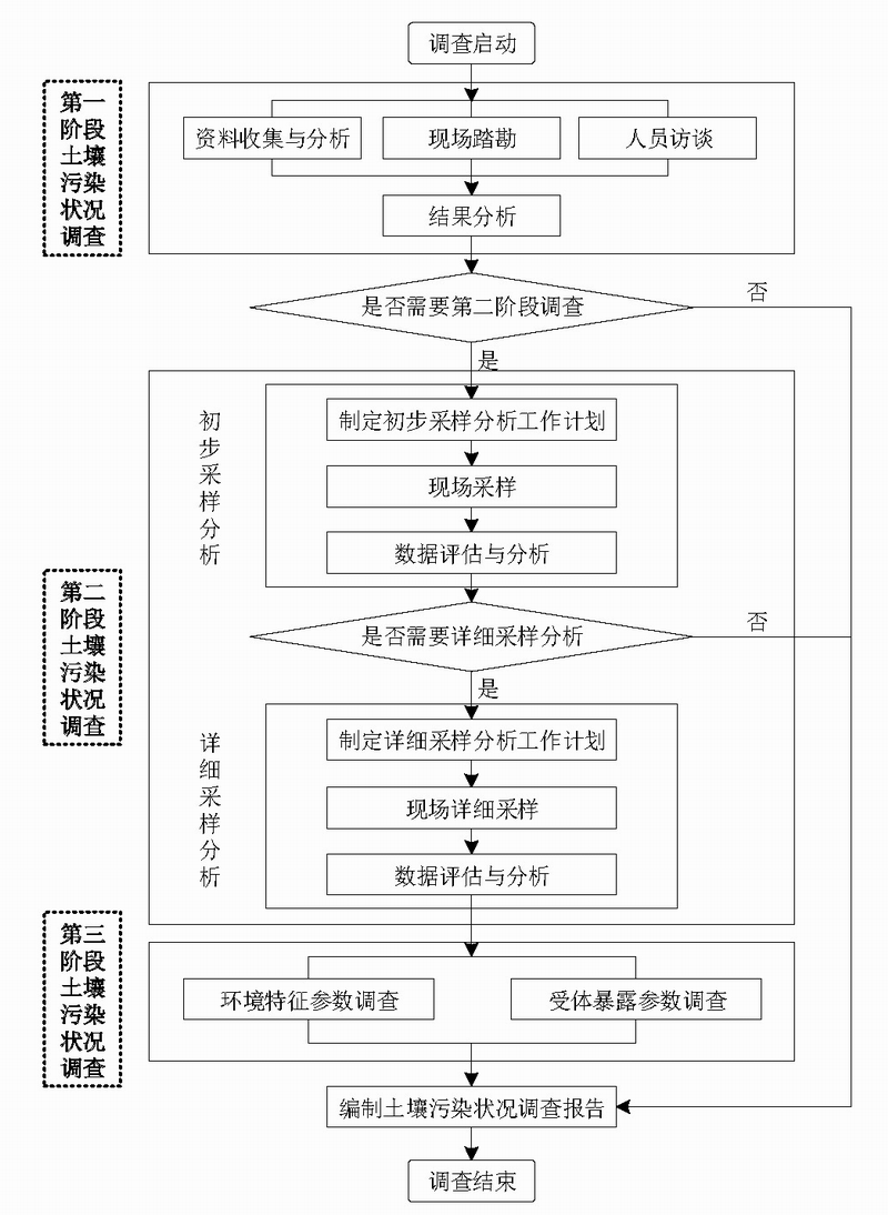 土壤污染狀況調(diào)查主要包括,第一階段土壤污染狀況調(diào)查(主要為資料收集與分析、現(xiàn)場勘查、人員訪談等)、第二階段土壤污染狀況調(diào)查(主要為初步采樣分析工作階段、詳細采樣分析工作階段)、第三階段土壤污染狀況調(diào)查(主要為地塊特征參數(shù)和受體暴露參數(shù)的調(diào)查)。主要工作流程如下圖: